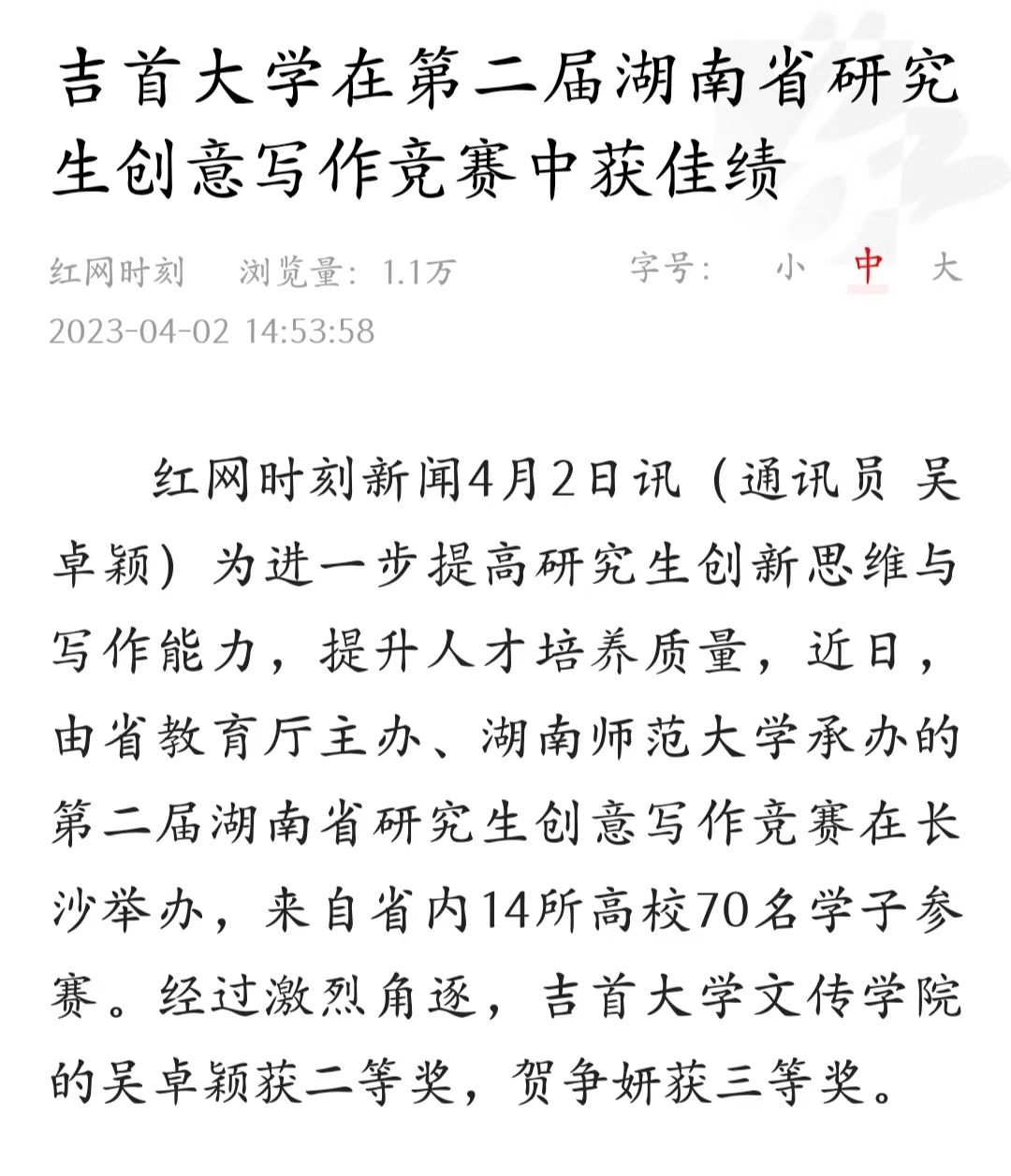 红网时刻新闻4月2日讯(通讯员 吴卓颖)为进一步提高研究生创新思维与写作能力,提升人才培养质量,近日,由省教育厅主办、湖南师范大学承办的第二届湖南省研究生创意写作竞赛在长沙举办,来自省内14所高校70名学子参赛。经过激烈角逐,william威廉英国官网文传学院的吴卓颖获二等奖,贺争妍获三等奖。