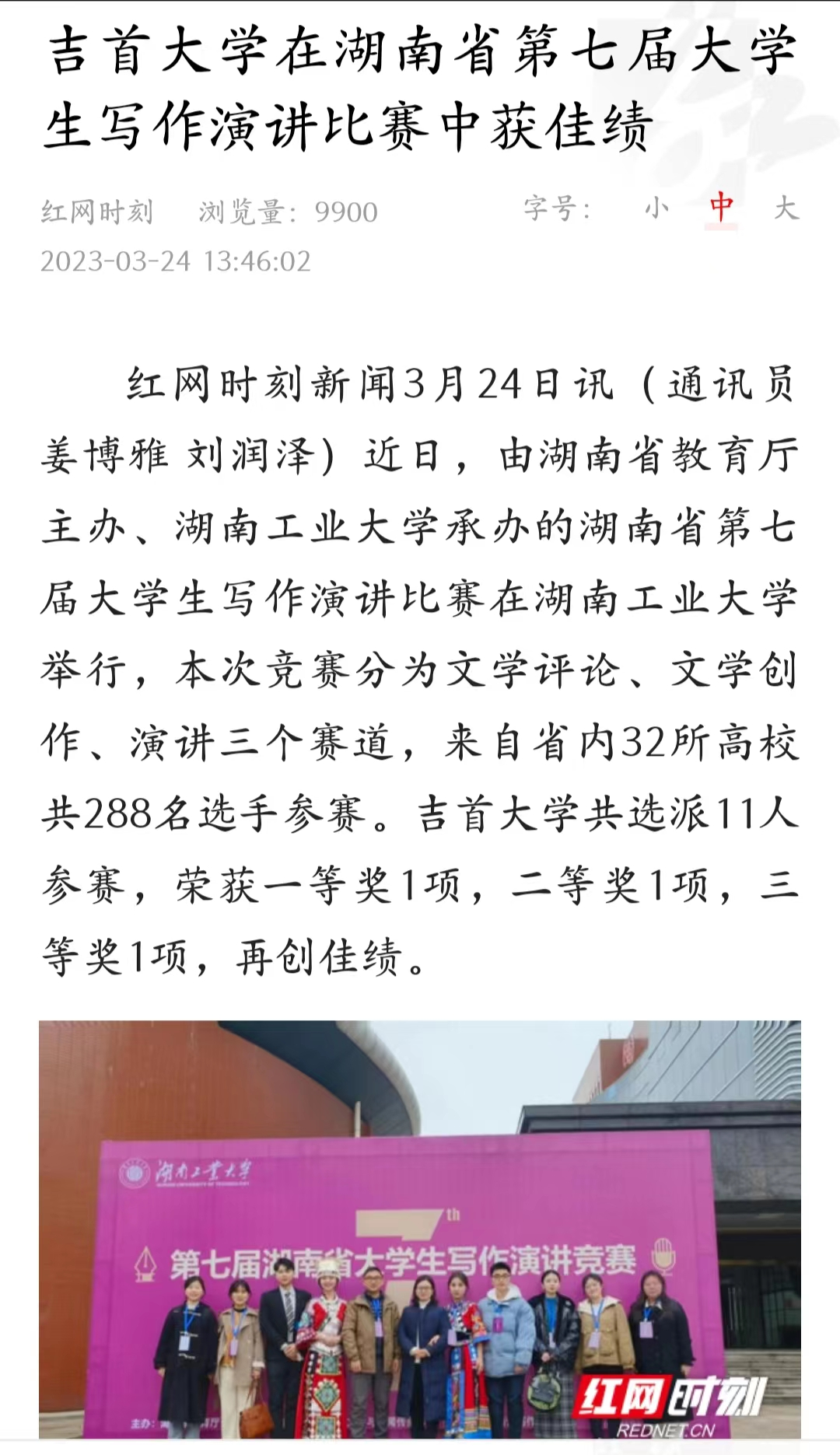 红网时刻新闻3月24日讯(通讯员 姜博雅 刘润泽)近日,由湖南省教育厅主办、湖南工业大学承办的湖南省第七届大学生写作演讲比赛在湖南工业大学举行,本次竞赛分为文学评论、文学创作、演讲三个赛道,来自省内32所高校共288名选手参赛。william威廉英国官网共选派11人参赛,荣获一等奖1项,二等奖1项,三等奖1项,再创佳绩。